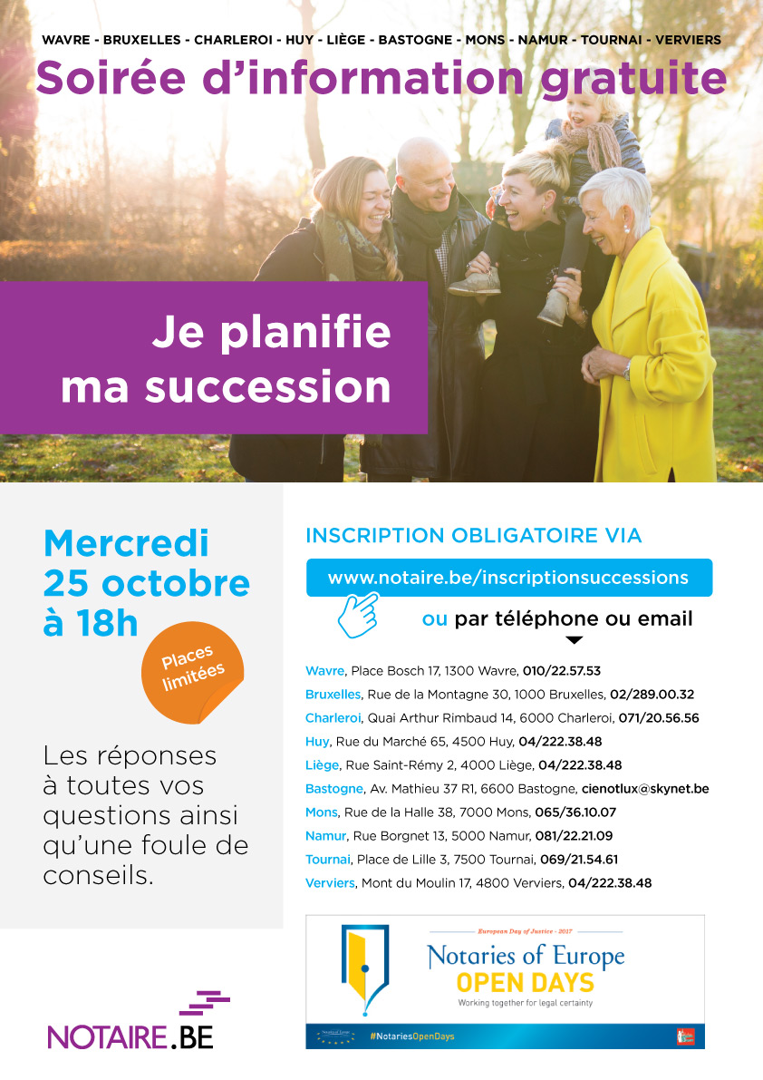 Un jour ou l’autre, elle nous rattrape tous… Certes, la mort n’est pas le sujet le plus plaisant. Et pourtant, il n’est jamais trop tôt pour préparer l’après. En plus d’être un gage de tranquillité, planifier sa succession présente de nombreux avantages au niveau fiscal et familial. Rendez-vous à la soirée d’information gratuite organisée par les notaires de votre province à 18h dans les maisons du notariat. Vous y obtiendrez les réponses à toutes vos questions, ainsi qu’une foule de conseils pour organiser la transmission de votre patrimoine en toute sérénité (contrat de mariage, testament, donations, ...). Les notaires y aborderont également la réforme successorale : ils épingleront les principaux changements qui impacteront votre succession.